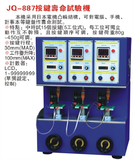 產品型號:JQ-887 品牌:劍 喬 用途:本機機械結構:采用臺灣變頻調速電機凸輪結構配合日本THK精密線性滑軌完成線性上下動作,電器控制部分:采用臺灣威倫觸摸屏+臺灣臺達控制器(PLC).可對計算機、手機、記事本、鍵盤等小型